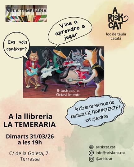 - Dimarts 31/03/26 a les 19h a la llibreria La Temeraria C/ Goleta, 7 Terrassa. Presentarem el joc i els gats d’A Risk Cat, amb la presència de l’artista dels quadres Octavi Intente. Farem partides on regalarem algun joc i tindrem els quadres a mida real.